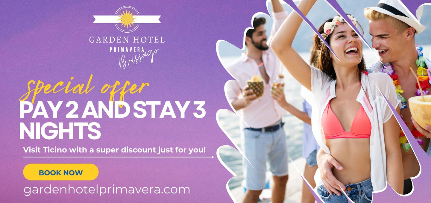 For the 2026 season, Garden Hotel Primavera has created an exclusive offer dedicated to young couples: if at least one of you is under 25, you can enjoy a 15% discount on your stay! This is a unique opportunity to discover breathtaking landscapes, relaxation, and nature, all while enjoying the comforts of a modern hotel in the heart of Canton Ticino at a very special price.