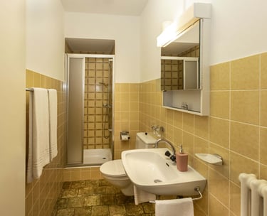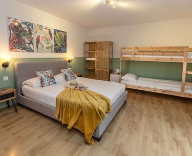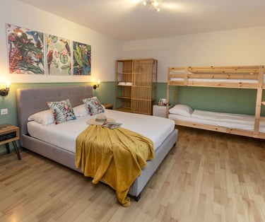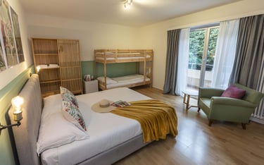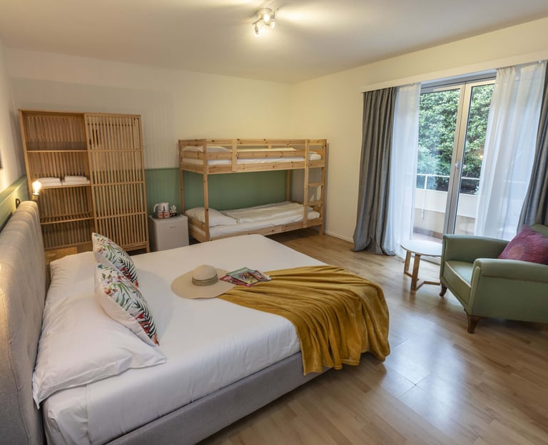 Camera familiare con balcone, di circa 25 m2, con bagno privato e asciugamani, può ospitare fino a 4 persone, possibilità di aggiungere un lettino bebè su richiesta. I cani sono i benvenuti in questa camera