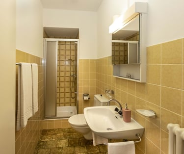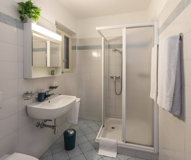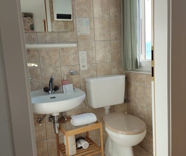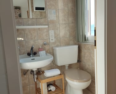 Piccola camera luminosa con balcone vista lago e lavandino in camera, di circa 10 m2. Bagno ad uso privano situato in corridoio, di fronte alla camera, con asciugamani. Può ospitare fino a 2 persone. I cani sono i benvenuti in questa camera.