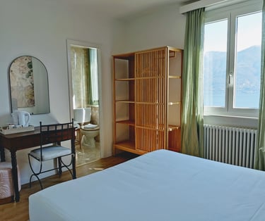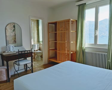 Camera luminosa con incredibile vista lago, di circa 14 m2, con balcone/terrazza, bagno privato in camera, asciugamani, può ospitare fino a 2 persone. I cani sono i benvenuti a soggiornare in questa camera.