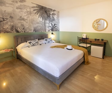 Piccola camera di circa 9m2 con bagno privato e vista sul retro della struttura. Ideale per soggiorni brevi. Un piccolo nido d'amore.