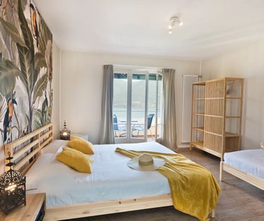 Camera luminosa con vista lago, di circa 25 m2, con bagno privato e asciugamani, può ospitare fino a 4 persone. Possibilità di aggiungere un lettino bebè su richiesta. I cani sono i benvenuti in questa camera.